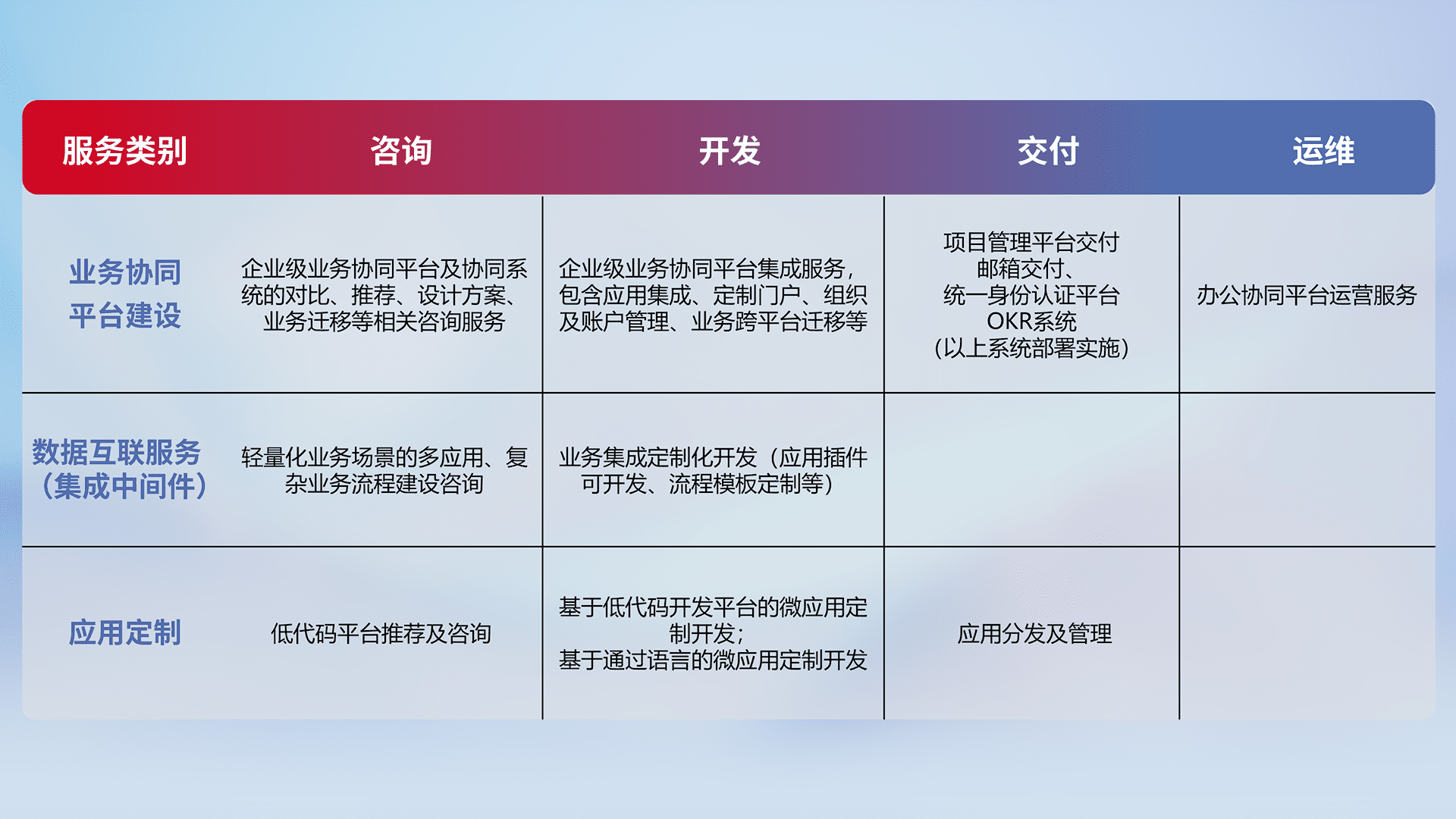 针对钉钉、、、企微、、IDaas等平台级产品提供产品的规划、、、、方案、、、、交付、、、、定制化开发等服务,,,实现如统一协同办公、、、、智能客户服务、、、混合会议管理、、、智能数据查询、、、等业务场景,,,,实现数字化转型。。。