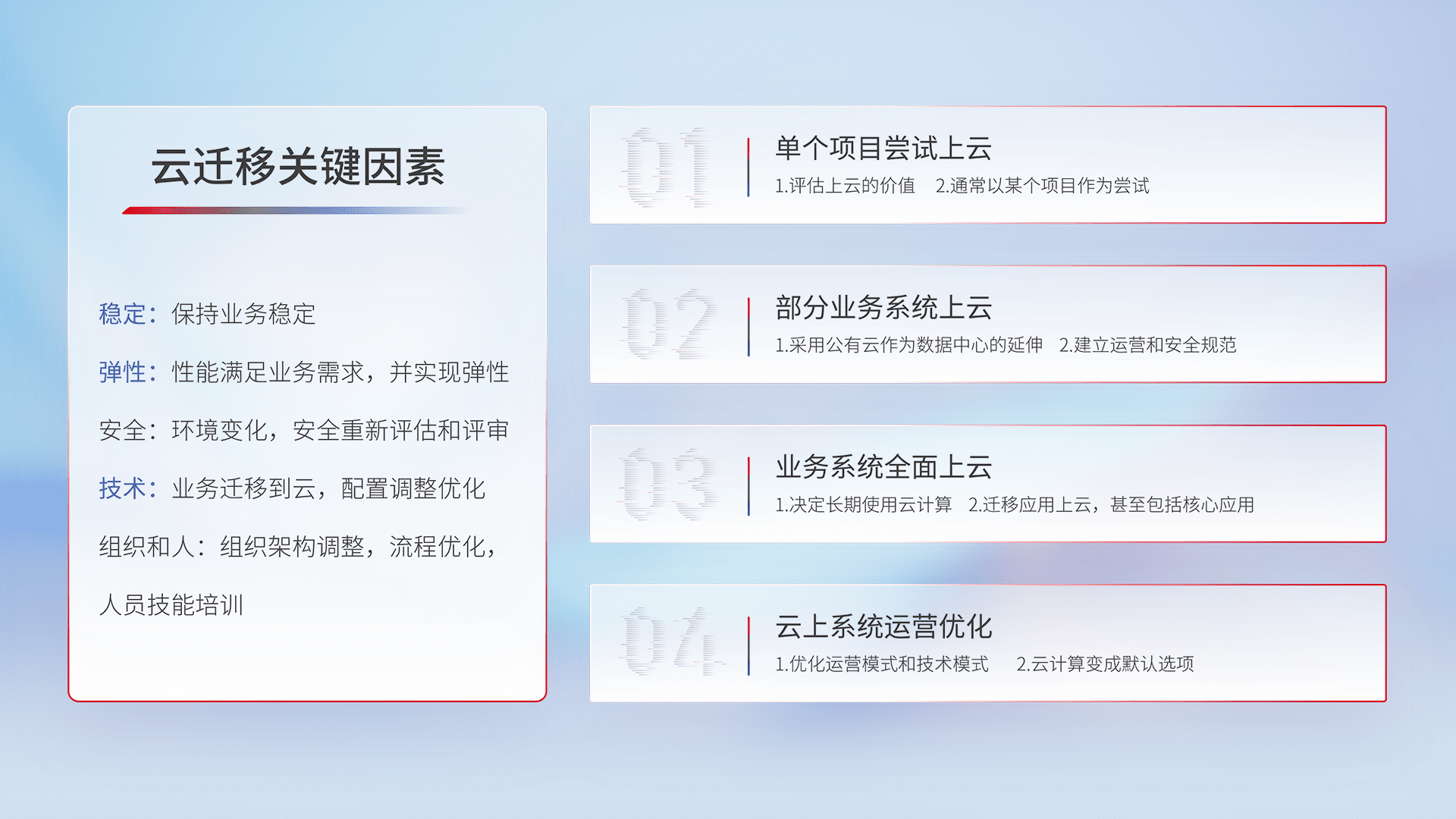 结合实际业务,,,从规划设计、、、云平台选型、、、、云原生改造、、、数据迁移、、、集成交付,,,迁移全过程为客户识别最佳上云路径,,,做好风险识别管理,,设计网络架构、、、、身份权限、、安全审计合规、、操作审计、、、日志审计、、监控告警策略、、、多站点容灾设计等,,对云上基础设施进行整体规划,,,提升IT治理水平,,,,以满足弹性、、高可用、、高性能的需求。。。