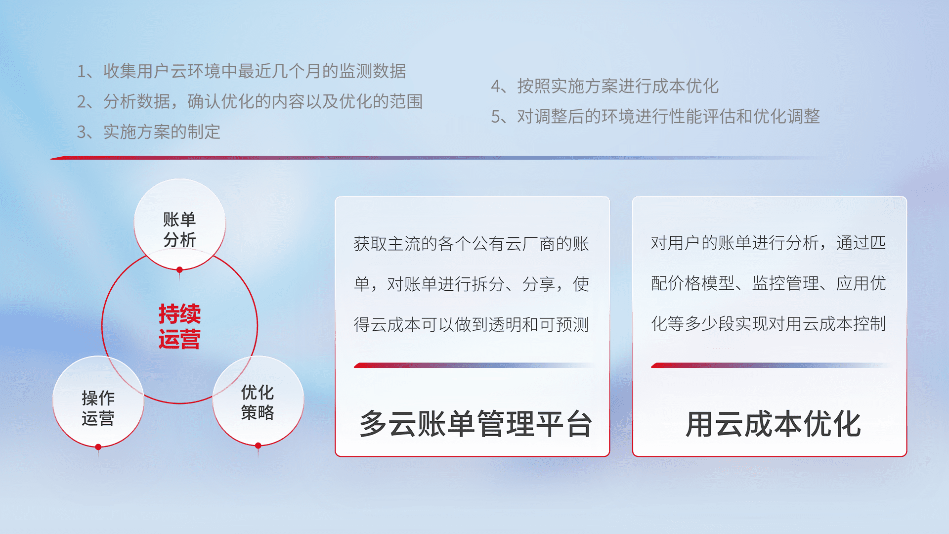 通过多云纳管,,,以统一的资源数据模型把客户的云资源进行抽象和封装,,,,进而实现对多云资源的统一操作,,,,保障云资源管理的可靠性、、、、稳定性与可用性。。。。量身定制化运维内容,,,,配置、、开发运维、、补丁管理、、备份、、、、监控、、认证和访问管理、、审计和日常巡检等,,,,保障在用云过程中的可靠度,,,稳定度以及高可用率。。。